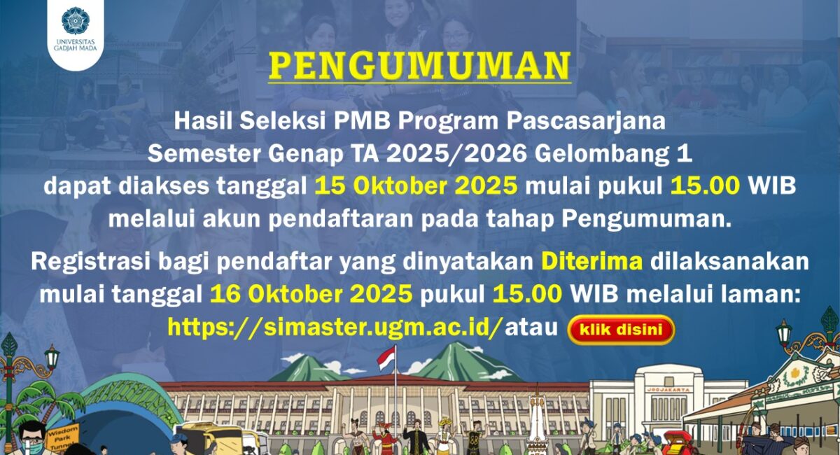 Halaman Utama 25 September 2023, 15.21 Oleh: admin 0 UGM tidak pernah mempublikasikan nilai passing grade dalam bentuk apapun. Mohon untuk tidak mempercayai informasi passing grade UGM yang beredar. Calon Mahasiswa Baru UGM harap tidak mempercayai berbagai pihak (termasuk yang mengaku sebagai civitas akademika UGM yang bisa menawarkan jasa apapun) karena justru akan merugikan calon mahasiswa baru. UGM tidak bekerja sama dengan lembaga bimbingan belajar atau kepanitian kegiatan-kegiatan try out. Semua petugas penerimaan mahasiswa baru UGM dibekali surat tugas. Pengumuman/Announcement UM.UGM.AC.ID :: Laman Resmi Informasi Penerimaan Mahasiswa Baru Universitas Gadjah Mada :: Peluncuran Seleksi Nasional Penerimaan Mahasiswa Baru 2026 =>> Panduan Pendaftaran Program Double Degree/Joint Degree LPDP Tahun 2025 Tahap 2