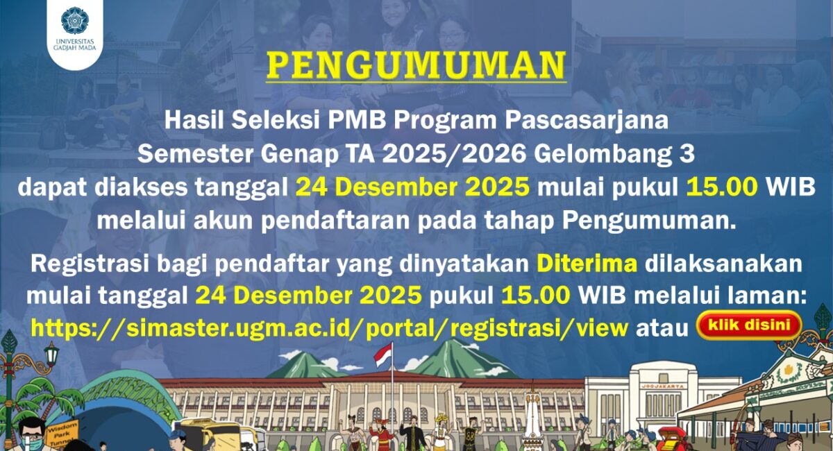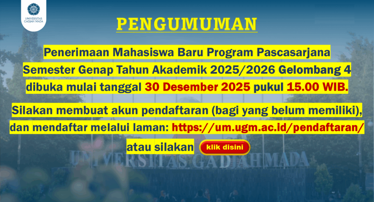 Main Page 4 March 2024, 07.50 Oleh: admin 0 PERHATIAN! UGM tidak pernah mempublikasikan nilai passing grade dalam bentuk apapun. Mohon untuk tidak mempercayai informasi passing grade UGM yang beredar. Calon Mahasiswa Baru UGM harap tidak mempercayai berbagai pihak (termasuk yang mengaku sebagai civitas akademika UGM yang bisa menawarkan jasa apapun) karena justru akan merugikan calon mahasiswa baru. UGM tidak bekerja sama dengan lembaga bimbingan belajar atau kepanitian kegiatan-kegiatan try out. Semua petugas penerimaan mahasiswa baru UGM dibekali surat tugas. Pengumuman/Announcement UM.UGM.AC.ID :: Laman Resmi Informasi Penerimaan Mahasiswa Baru Universitas Gadjah Mada :: Sosialisasi Daring Pendaftaran SNBP Tahun 2024 Webinar Sosialisasi Pendaftaran KIP Kuliah Merdeka Tahun 2024 Penerimaan Mahasiswa Baru Universitas Gadjah Mada Tahun 2024 Informasi Mekanisme Seleksi Nasional Penerimaan Mahasiswa Baru (SNPMB) Tahun 2024